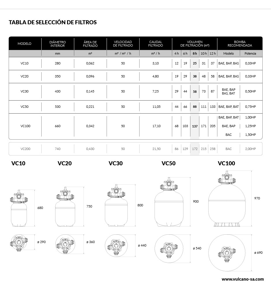 Filtro soplado VC-10 Vulcano de ø 290mm, para piletas de hasta 20m³, con multiválvula selectora de 6 vías con las funciones de filtrado, retrolavado, desagote, enjuague, centrifugado y cerrado.